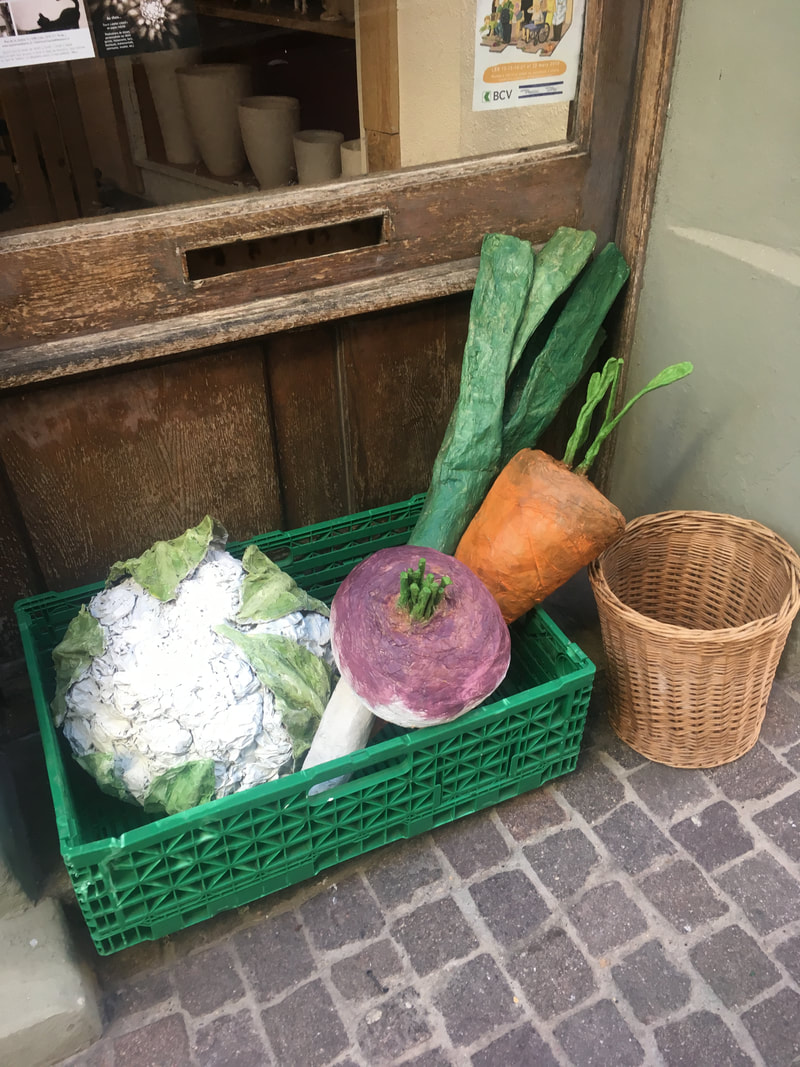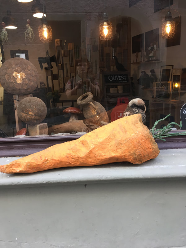 Carotte en papier mâché pour la vitrine de l'épicerie "Delicatessen" à Cully